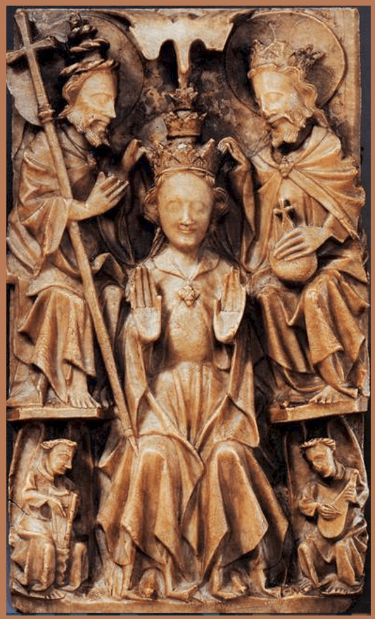 Yoga and the experience of Bliss at Sahastrara were common knowledge here in the West! Nothing exotic about it. It is part of our ancient Culture. The sad side of the story is that in the 18th C. AD the Church eliminated this Divine knowledge out of its liturgical texts.. for some unknown reason.. This could be subject of an intriguing investigation.Did the leaders of the Church want to avoid that people became aware that the Ultimate goal of Spirituality is Union of the Self (in the individual) with God (in a direct relationship) – which would eliminate the need to have a priest or church as intermediate between God and the people? Yoga as threat to the raison d’etre of the institutionalized priesthood..?The beauty about the ‘Corona Aureola’ theory is that the whole of Western art, from the early Middle Ages until the 18th century, is full of evidence that this knowledge was well established and permeated throughout our culture – in many different forms of religious or artistic expression: liturgical texts, theological treatises, hymns, poetry, miniatures or illuminations of manuscripts, panel paintings, retables, sculptures, etc..An example of such expressions that carry the knowledge that yoga takes place at the top of the head is the attached picture of an alabaster 15th century statue depicting the ‘Assumption and Coronation of the Virgin Mary’ (I found this online and the description is: ‘The Virgin, serenely smiling, sits with Her hand palms [raised towards the viewer], in a gesture of prayer’ [read: blessing Her devotees] as She is crowned with a triple crown by ‘the Trinity’.Mother Mary -15th century: Source“To the left, the Son touches the crown with his right hand and with his other arm holds the cross-staff: he is crowned with what appears to be a triple torse or crown of thorns. To the right, a crowned God the Father touches the Virgin’s crown with his right hand while his left rests on an orb. Top centre, the dove of the Holy Spirit holds the finial of the triple crown in its beak. Below the bare-footed figure of Father and Son are angels playing musical instruments.’The religious text of the time, for instance the writings of Bede, Thomas Aquinas and Durandus, spoke of the triple ‘corona aureola’ as a reward that was only reserved for the highest saints, who enjoy a very special ‘beatitude’ (bliss) –because they went above and beyond normal saintliness.. in THREE different ways: through Virginity, Martyrdom (those who died for their Faith) and Doctorship (the knowledgeable ones who converted others to Faith and guided them on the path righteousness (Dharma). In the ancient texts where this is described we see that Mary and Christ were the only personalities that were recognised as having these TRHEE qualities all at once. They won three main battles on this Earth, the battles against the three enemies of the Soul.. : (1) what was called the ‘Flesh’ (lust), (2) The World (worldly power) and (3) the Devil (impure knowledge).Mary and Christ overcame these three main enemies, temptations – whereas other special saints usually overcame only one of them: as Virgins they remained untouched by lust, as Martyrs they remained unmoved by ‘the world’ (worldly power) and as Doctores, through their pure knowledge they remained unwavered by temptations by the devil and convinced others to follow them in the path of Dharma. The Virgin Mary and Christ were recognized as having these three qualities all at once – and were therefore represented with three crowns.I would like to make a side note about the Tiara – a head dress that is built with three layers of crowns. It’s form is derived from this theory, and that God Almighty would wear a Tiara is understandable. It is of course questionable that any human (.. I refer to our popes..) would have dared to wear the Tiara – as the combination of three Aureola crowns was reserved for only the Highest Divine personalities…In the 15th Century alabaster statue (see picture), Mary is being crowned by the Father and the Son, but not with a regal crown.. (yes one of the names of the Virgin Mary is ‘the Queen of Heaven’, and yes, therefore Her Crown is often regal..), but in this case we see a Triple crown… It is a metaphor of the Triple Bliss which Mary enjoys – because of Her Supreme State, of being at once a Virgin, a Martyr and a Doctor: (1) She is obviously the Virgin Mary, (2) She suffered more than anyone as she personally saw her Son, the Son of God, dying on the cross at the hands of humanity (just imagine seeing your own child being killed on a cross in the same way – it is unbearably painful and worse than the own pain of a martyr; this thought that is even worse when you realise that this humanity is her own Creation, Her children), and (3) She was known at the First Teacher of the Church as no one else would have known the early stories of the Flight to Egypt, Birth of Christ in the manger, the very fact that Christ was divine, the Adorations of the Magi, the Youth of Christ and his early expressions of Divinity.