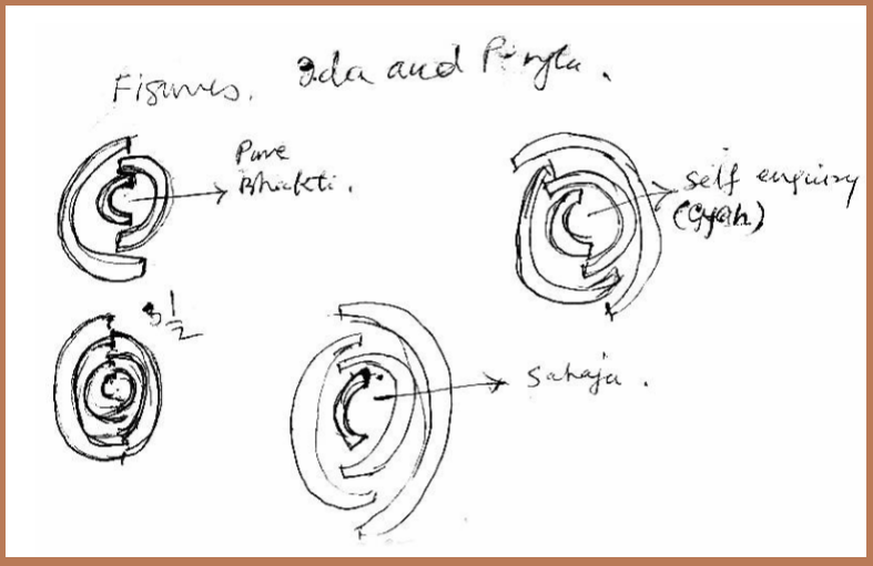 “This is a drawing of the three nadis (i.e. subtle energy channels, left – Ida Nadi -, right – Pingala Nadi – and central, -Sushumna Nadi) and three great powers by our Mother, Shri Mataji:
