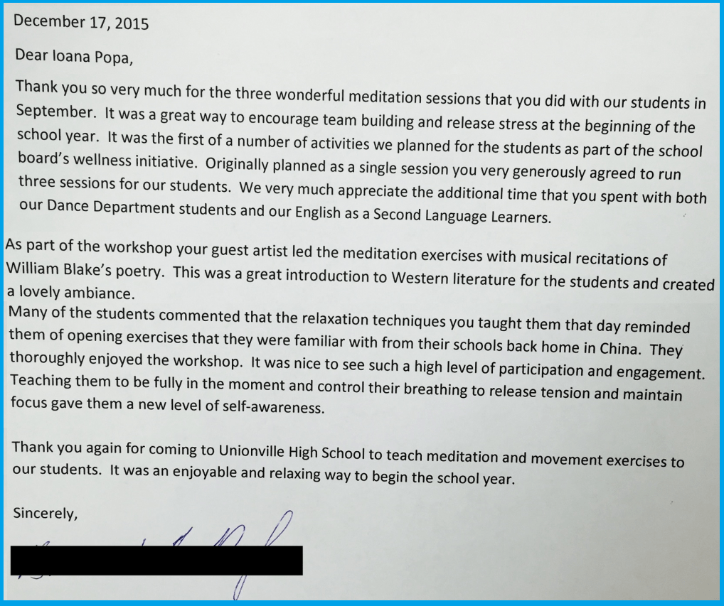 Appreciation Letter from School to Sahaja Yoga Meditation team