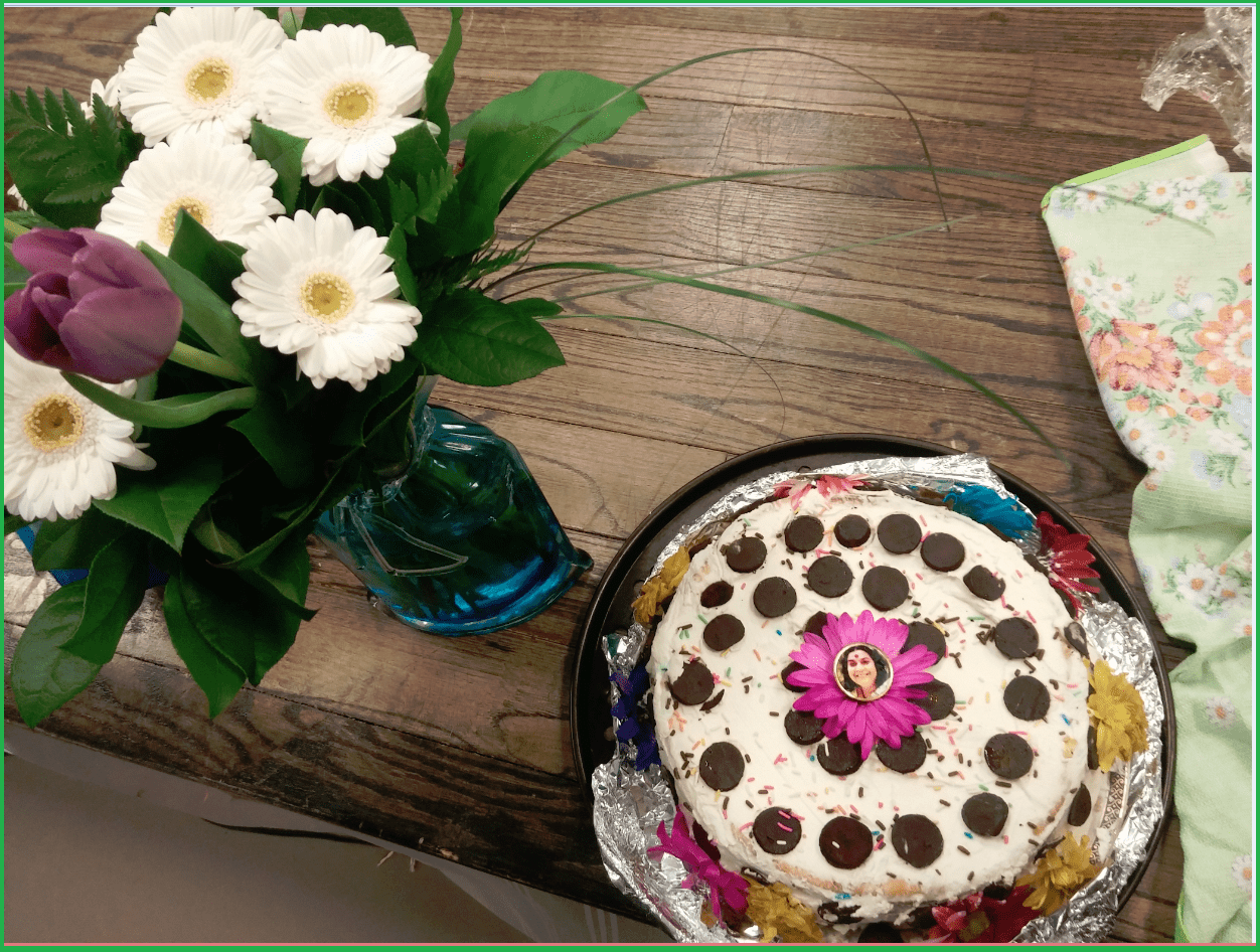 Daniel Black Bear from Eagle Clan is preparing to perform indigenous traditional music and danceMama Carmela from Burlington class prepared an amazing cheese cake for Paula and Daniel – both born in March.