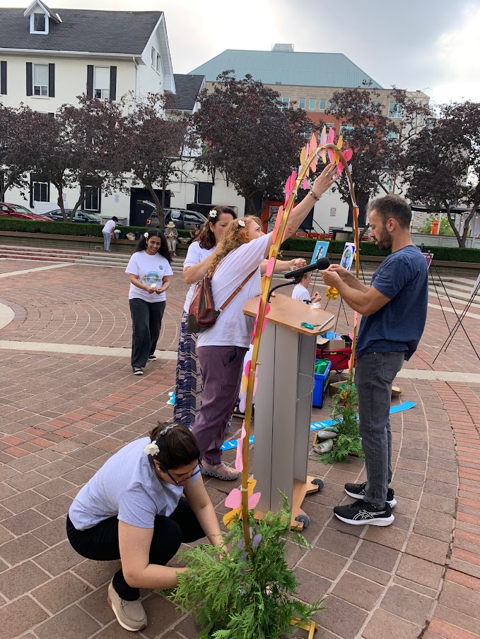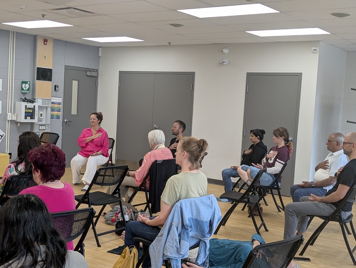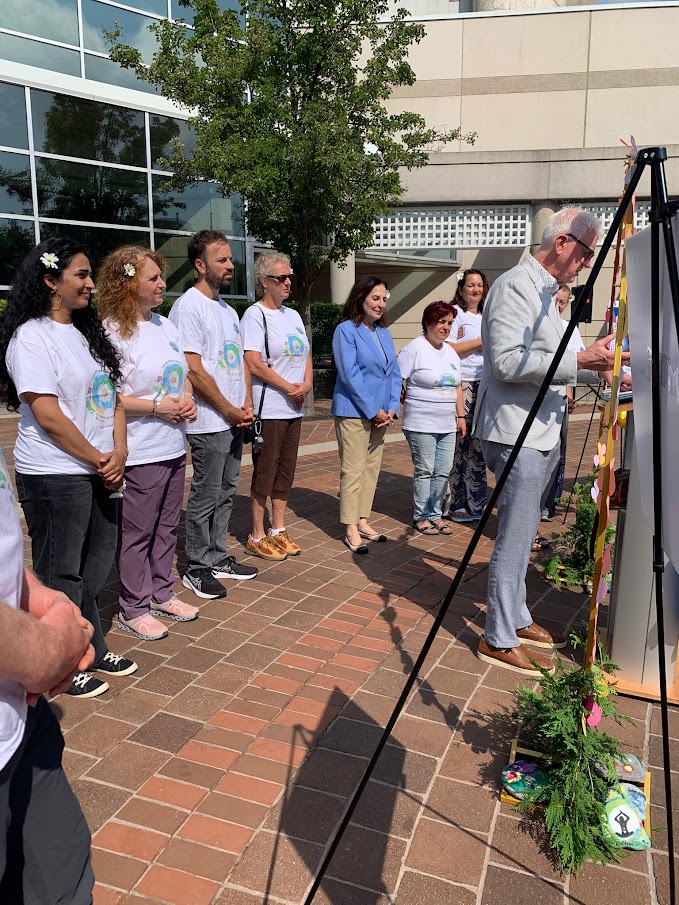 On Friday morning, June 20, 2025 a few of us from Halton Sahaja Yoga Meditation Network came to Burlington’s City Hall’s Plaza to prepare for the Flag Raising Ceremony. As it was a working day, not many were able to join for the set-up but Michael was able to come and help. The day before was dark with clouds and the prognosis was about the same for this day as well. However, we all remarked how progressively it became sunnier the moment we started to come together and joyfully decorate the space, getting ready for this historic moment for our team of Halton-based volunteers.