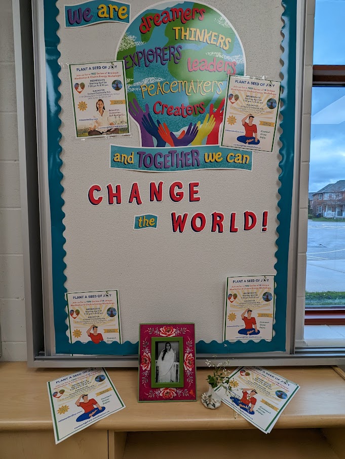 You can meet Michael if you’re joining our weekly Sahaja Yoga Meditation classes that are offered in Burlington all year-long at the Orchard Hub. In fact, the two images you see above, the one with “Changing the World” is from the same room where we meet every Wednesday evening at 7pm. The image with the Wings is from the same building, and it was taken on the election day this year, when we’ve been walking through the hallways. Aren’t they both carrying such inspiring messages?