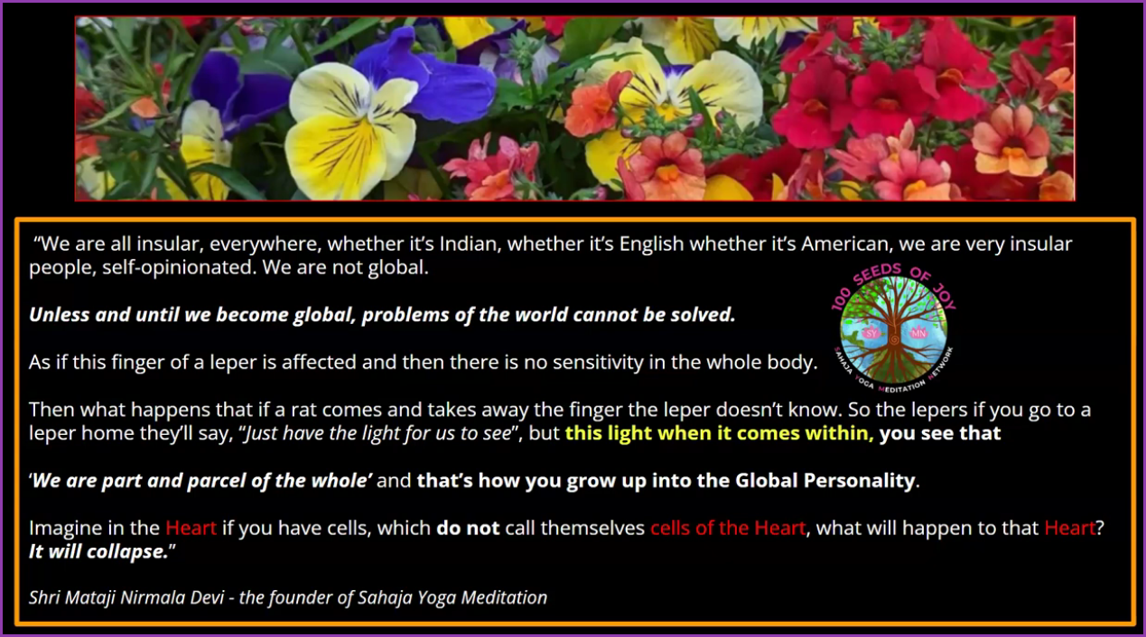 Enjoy a few slides with Quotes from Shri Mataji Nirmala Devi – the founder of Sahaja Yoga Meditation – teaching about Self-Realization and the Global Personality