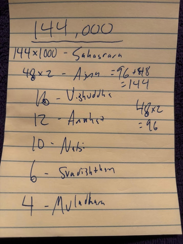 The combined numbers of the first six chakras total 144, and when multiplied by the 1000 petal lotus at the crown chakra, give us a total of 144,000.
