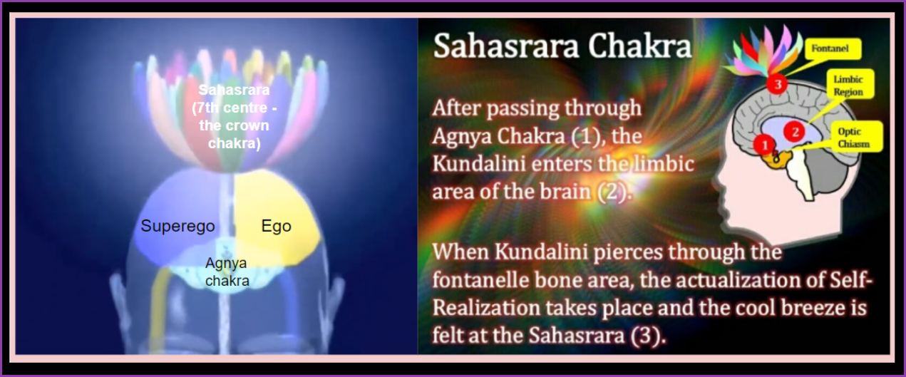 “First the thoughtless awareness is the state you achieve. That happens when Kundalini crosses this spot (i.e crown chakra).