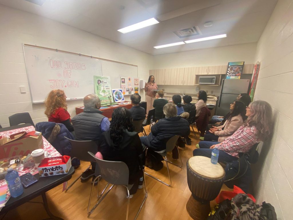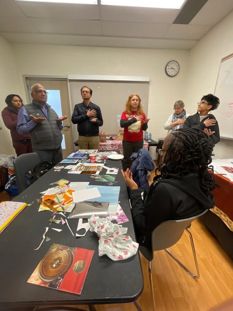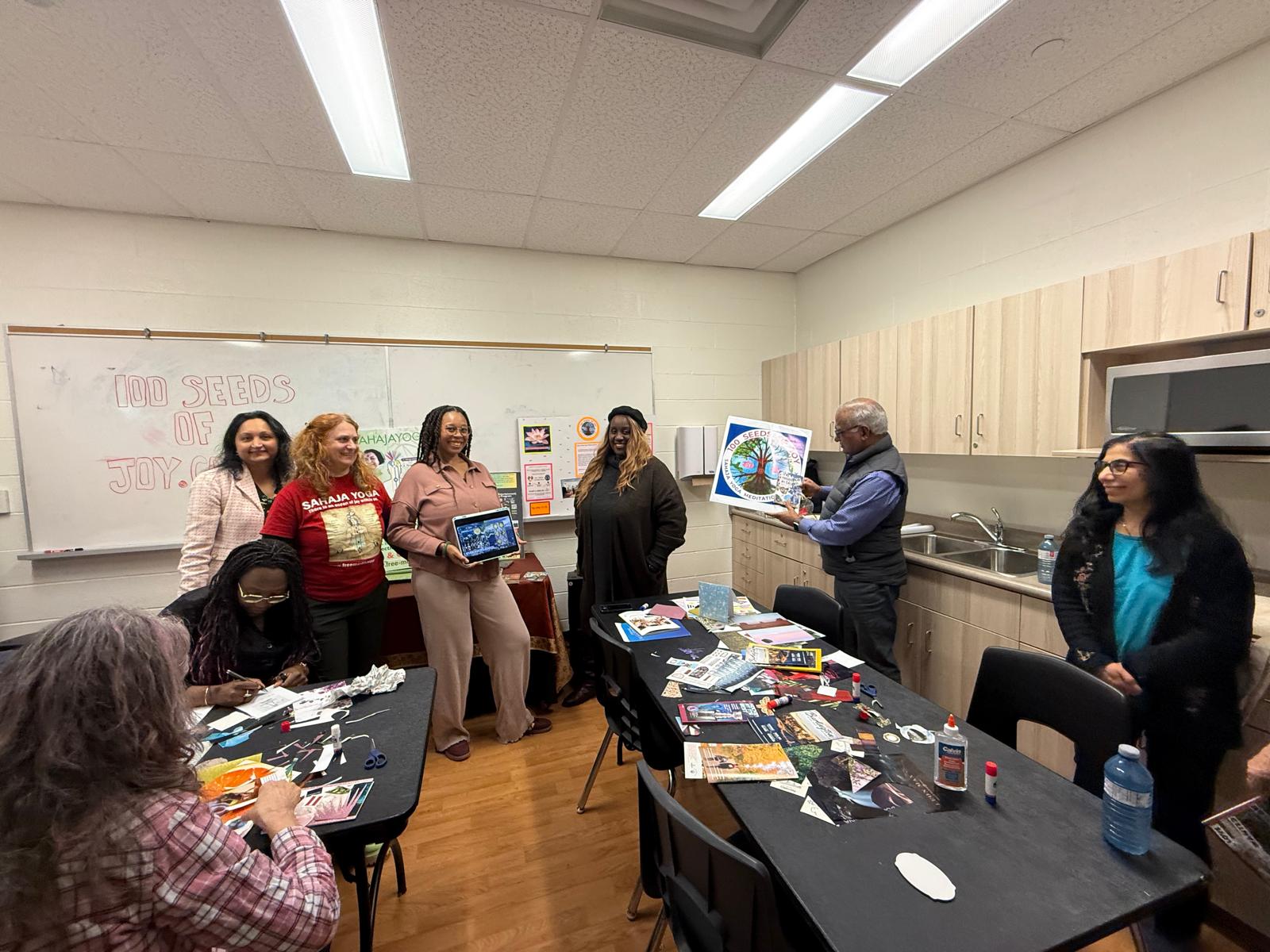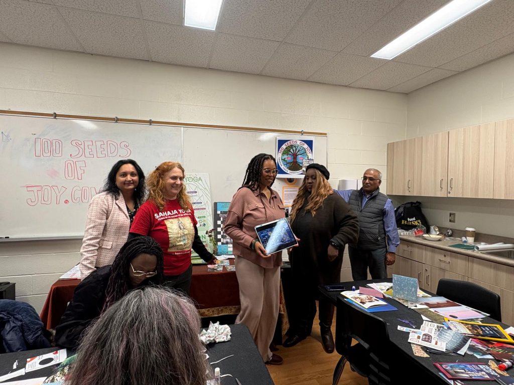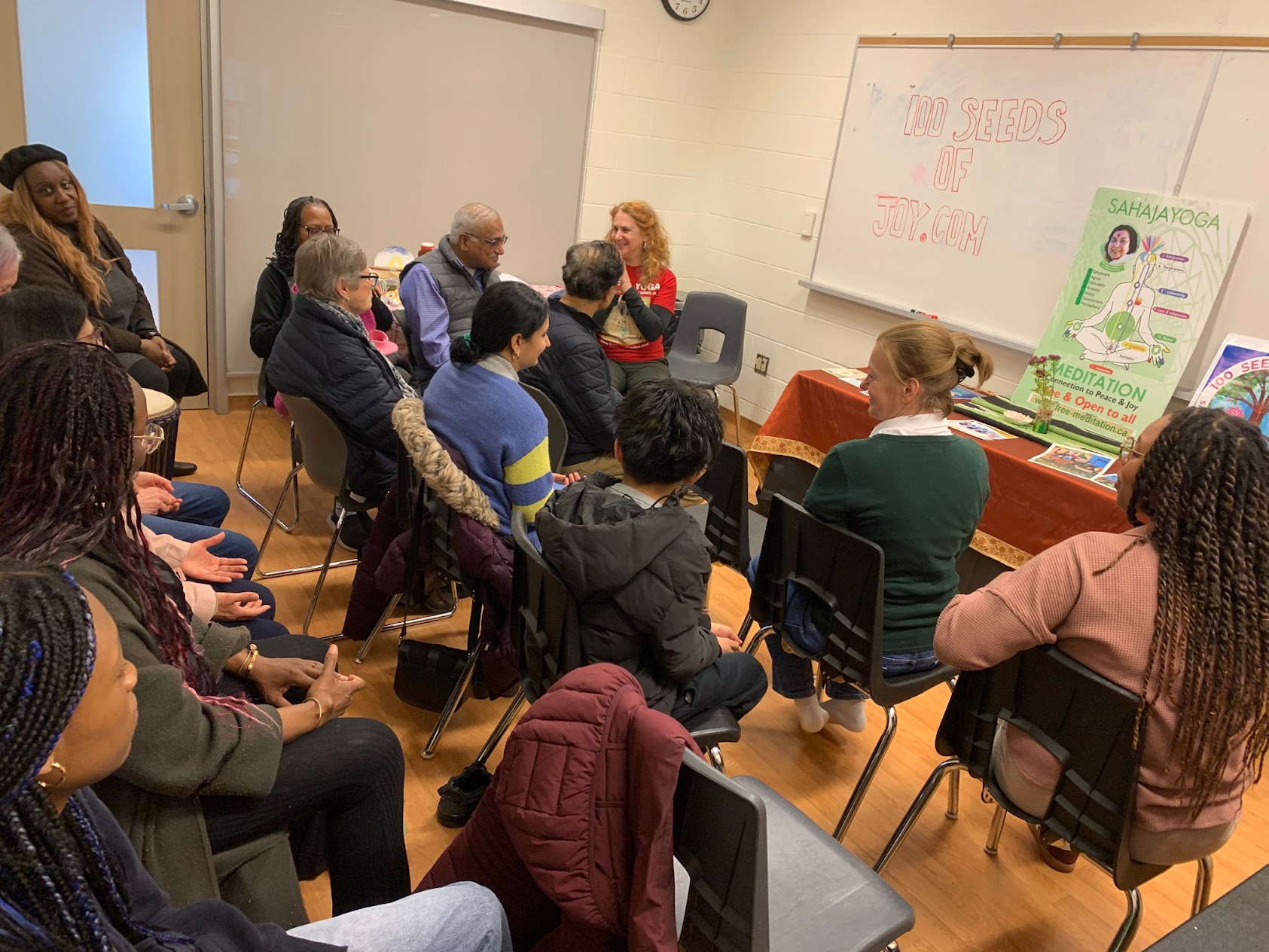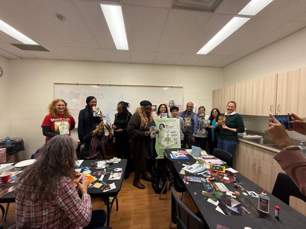 Djenabe is seen in the photo above, introducing the participants to “A Collage Workshop Experience” (a program she created), right after 100 Seeds of Joy offered a Guided “Sahaja Yoga Meditation Experience” and collected beautiful feedback from Everyone in the room